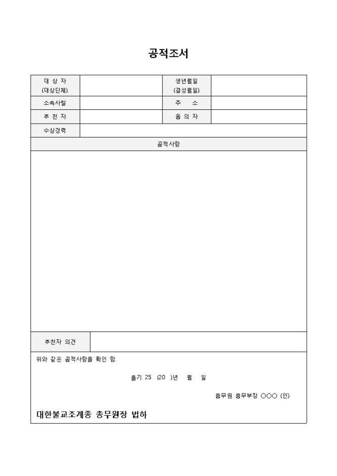 공적조서(불자)입니다. 대상자, 생년월일, 소속사찰, 추천자, 수상경력, 공적사항 등의 항목으로 구성되어 있습니다. 불교에서 불자에 대해 공적조서 작성시 사용할 수 있습니다.