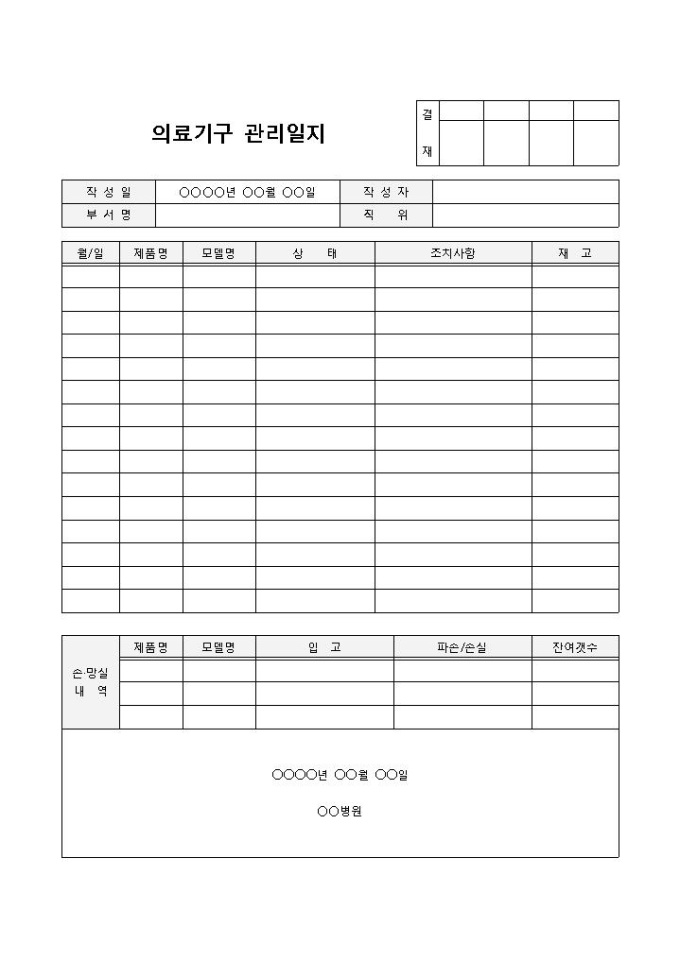 의료기구 관리일지 입니다. 월/일, 제품명, 모델명, 상태, 조치사항, 재고 등으로 구성되었으며, 잔여갯수 파악에도 용이합니다.