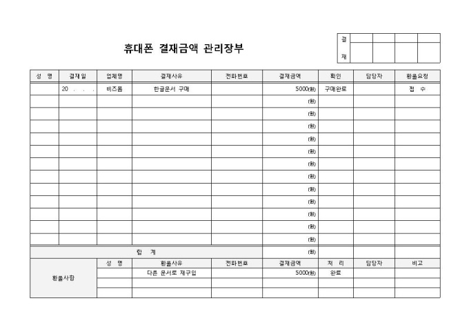 휴대폰 결재금액 관리장부 입니다. 성명, 결재일, 업체명, 결재사유 등으로 구성되있으며, 환불요청시 진행사항 및 처리내역을 신속하게 기입할 수 있습니다.