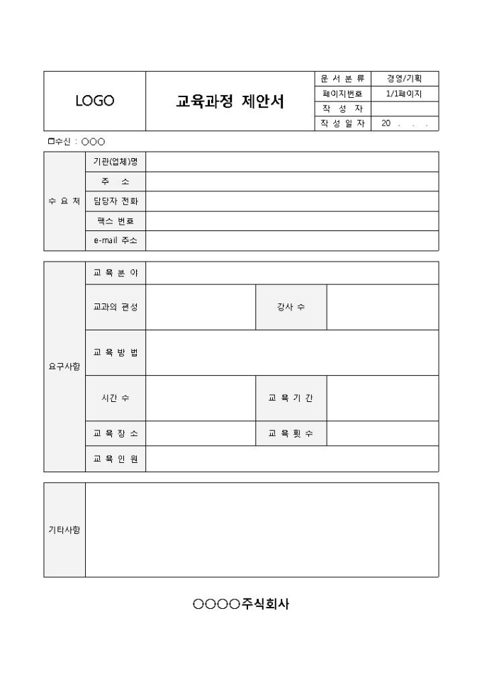교육과정 제안서 입니다. 수요처, 교육분야, 교과의 편성, 강사수, 교육기간, 교육시기, 교육인원 등으로 구성되었습니다. 기타사항을 통해 보다 구체적인 내용을 기입할 수 있습니다.