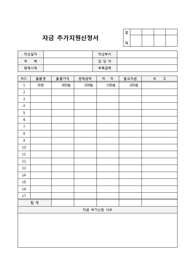 구매자금 추가신청서 입니다. 물품명, 물품가격, 현재금액, 차이, 필요자금 등으로 구성되었으며, 구매물품을 작성하고 그에 따른 필요액을 추가로 신청할 수 있습니다.