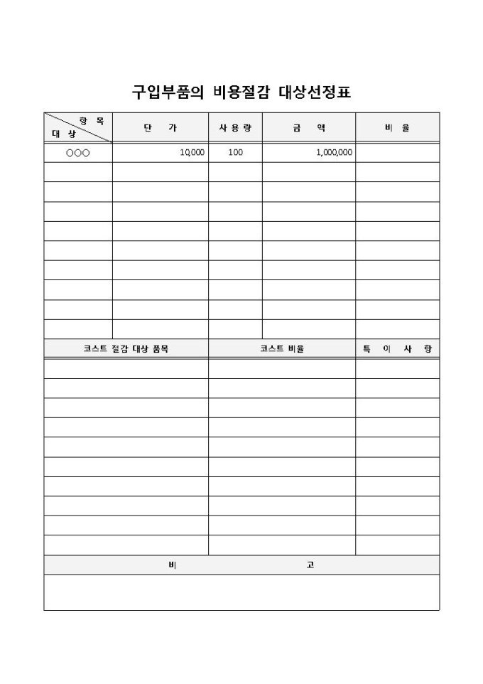 구입한 부품에 대한 비용절감 대상 품목을 선정할 때 사용되는 구입부품의 비용절감 대상선정표 양식입니다. 대상, 항목, 단가, 사용량, 금액, 비율, 비용 절감 대상 품목, 비율 등의 항목으로 구성되어 있습니다.