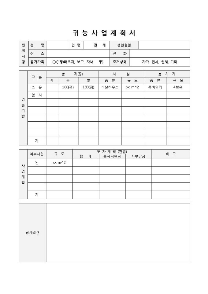 귀농사업계획서 입니다. 인적사항, 사업계획, 평가의견 등으로 구성되었습니다. 사업자의 인적사항 및 계획내용을 간편하게 작성할 수 있습니다.