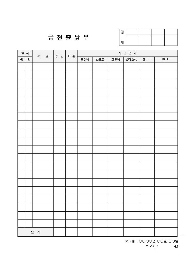 9,000원/월금전출납부 입니다. 통신비, 소모품비, 복리후생, 적요 등으로 구성된 양식입니다. 금액 출납 파악에 효과적이며, 특이사항 기록에도 용이합니다.