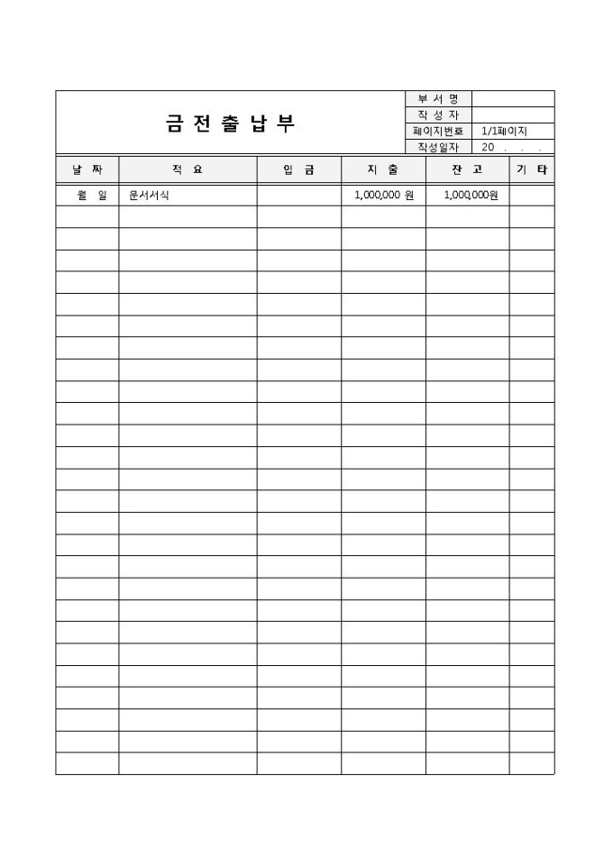 9,000원/월회사의 현금의 입금, 출금 사항을 매일 기록할 때 사용되는 금전 출납부 양식입니다. 날짜, 적요, 입금, 지출, 잔고, 기타의 항목으로 구성되어 있습니다.
