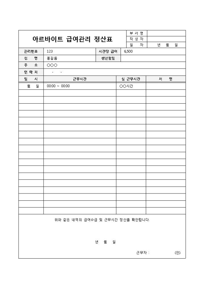 9,000원/월아르바이트 시 급여의 관리 및 정산을 위해 사용되는 급여관리정산표(아르바이트) 양식입니다. 관리번호, 시간당 급여, 성명, 주민등록번호, 주소, 연락처, 일시, 근무시간, 실 근무시간 등의 항목으로 구성되어 있습니다.