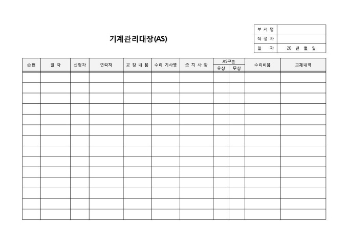 기계관리대장 입니다. 순번, 일자, 신청자, 연락처, 고장내용, 수리기사명, 조치사항 등으로 구성되었습니다. 수리비용을 계산하고 그에 따른 부품교체내역 파악에 용이합니다.