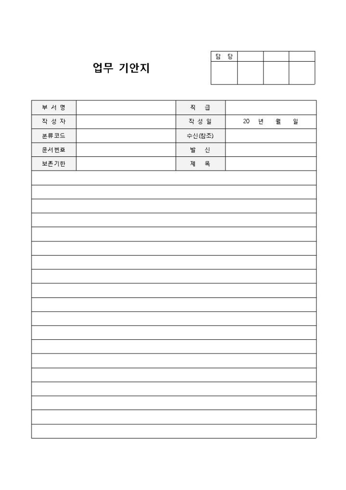 기안지(업무)입니다. 부서명, 작성자, 분류코드, 문서번호, 보존기한 등의 항목으로 구성되어 있습니다. 업무 내용에 대해 간단하게 기안할 경우 사용할 수 있는 양식입니다.
