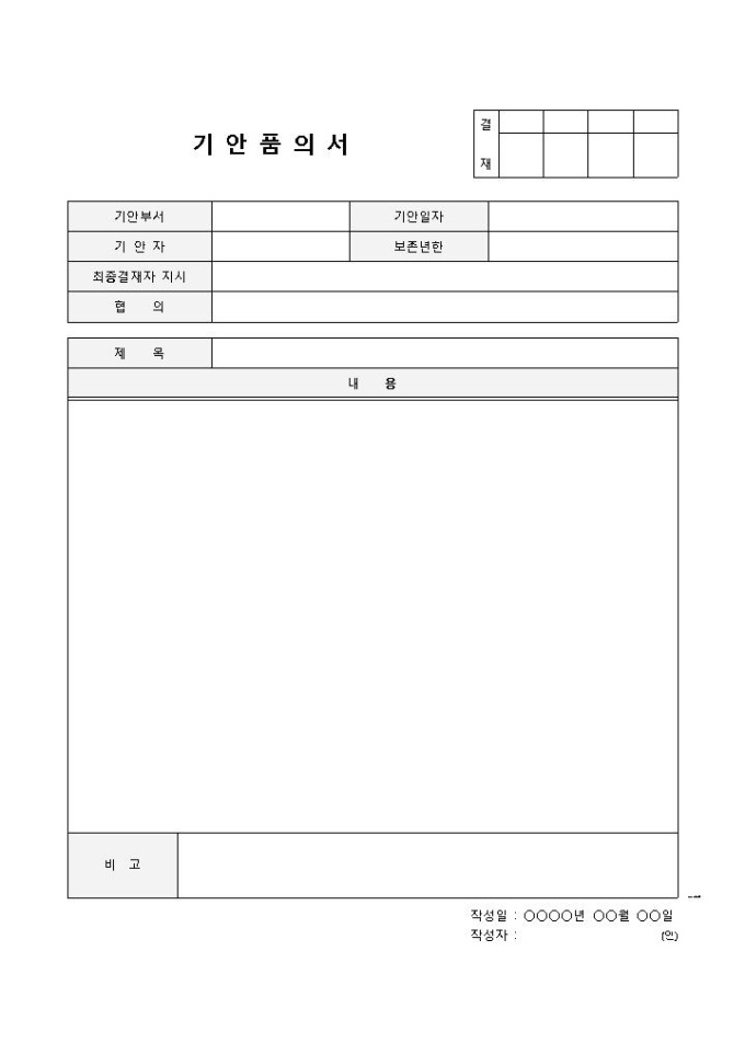9,000원/월기안품의서 입니다. 기안부서, 기안일자, 보존년한, 협의 등으로 구성되있으며, 비고란을 통해 세부적인 내용이나 특이사항을 기입할 수 있습니다.