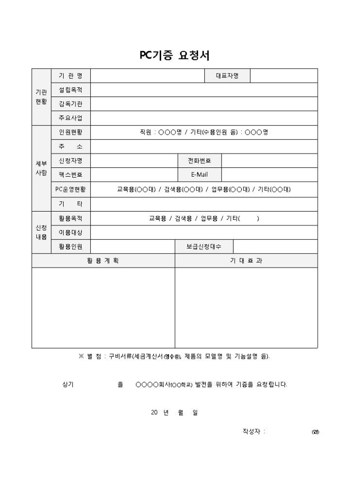 9,000원/월pc기증 요청서 입니다. 기관현황, 세부사항, 신청내용 등으로 구성되었습니다. PC기증 요청시 발생할 활동계획 및 기대효과를 간편하게 작성할 수 있습니다.