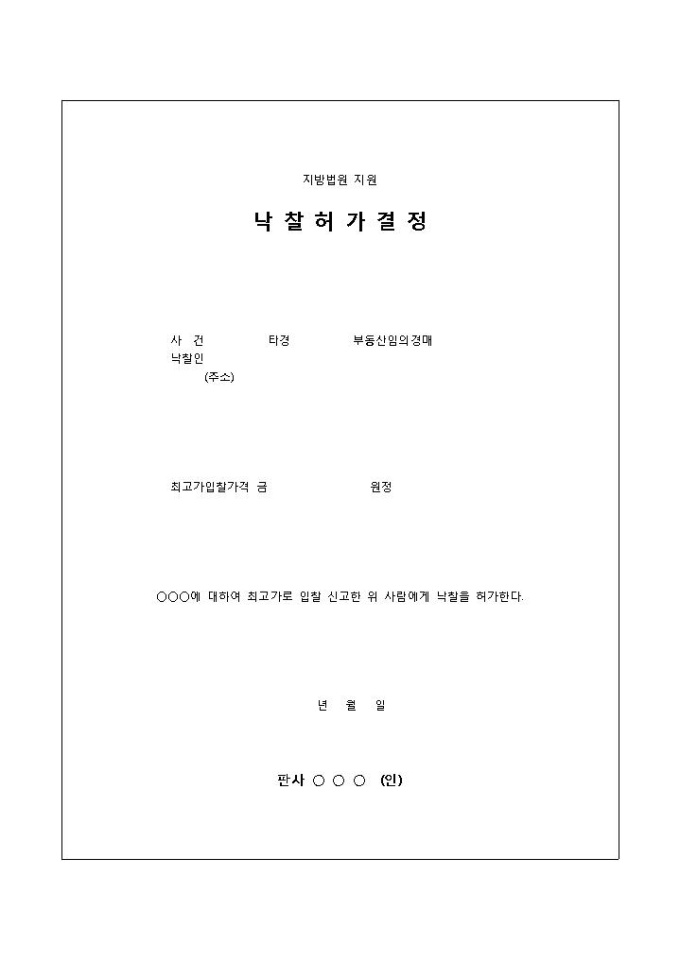 9,000원/월최고가로 입찰 신고한 해당자에게 낙찰을 허가한다는 내용의 낙찰허가결정서 양식입니다. 사건, 타경, 낙찰인, 주소, 최고가 입찰가격, 일자 등의 항목으로 구성되어 있습니다.