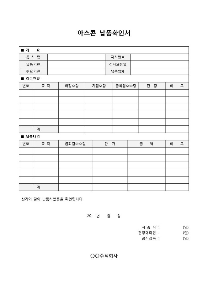 9,000원/월납품확인서(아스콘)입니다. 개요, 검수현황, 배정수량, 납품내역 등의 항목으로 구성되어 있습니다. 공사현장에서 아스콘 납품 후 확인 받을 경우 사용할 수 있는 양식입니다.