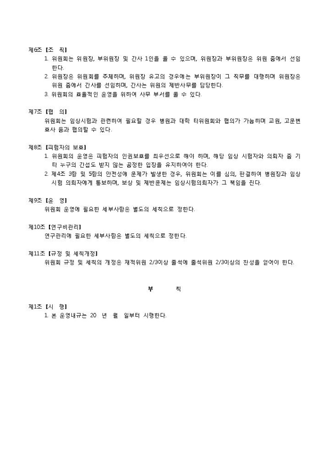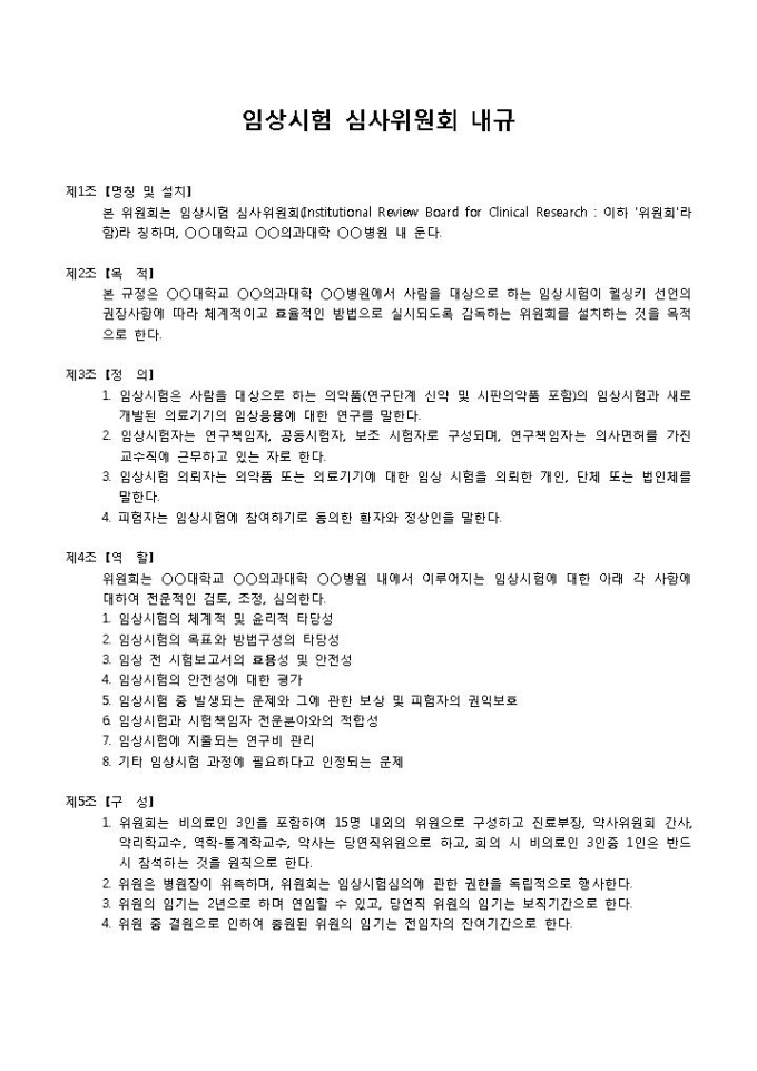 9,000원/월내규입니다. 명칭 및 설치, 목적, 정의 역할, 구성 등의 항목으로 구성되어 있습니다. 대학교 의과대학 병원에서 임상시험 심사위원회를 뒀을 경우 사용할 수 있는 내규 양식입니다.