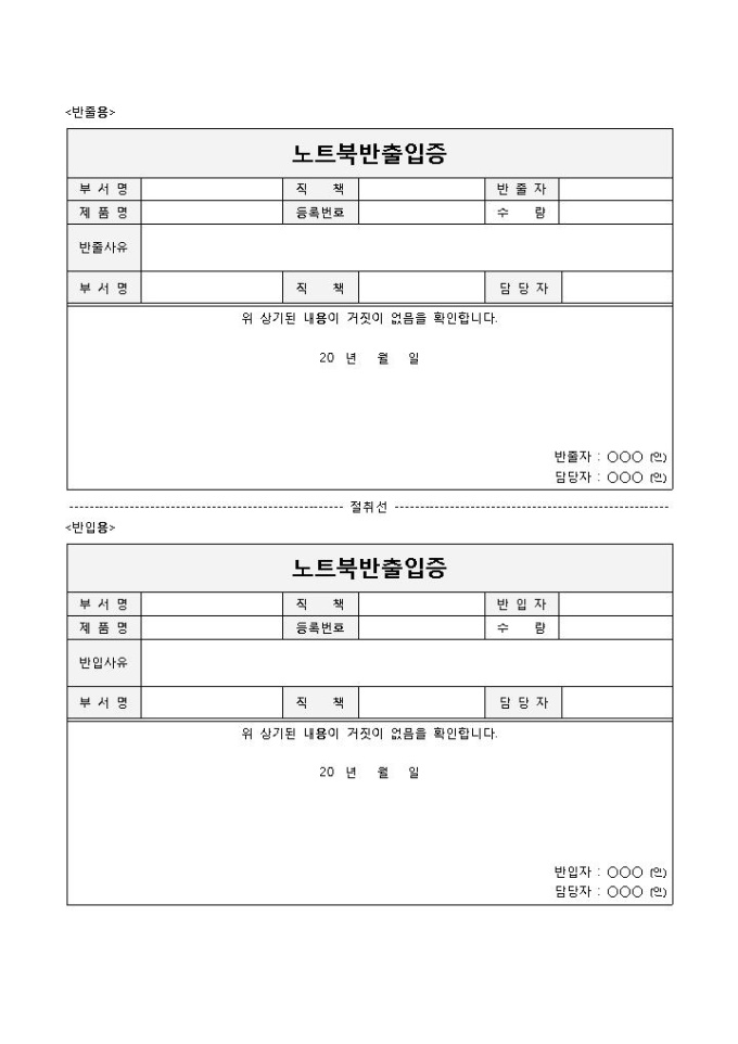 9,000원/월노트북반출입증 입니다. 부서명, 직책, 반출자, 제품명, 반출사유 등으로 구성되었습니다. 반출증 불출 및 관리에 용이합니다.