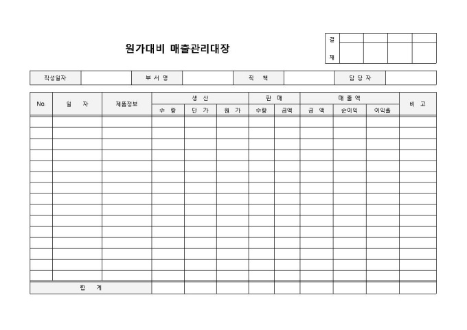 단가대비표 입니다. 일자, 제품정보, 생산, 판매, 매출액 등으로 구성되었으며, 비고란을 통해 세부적인 사항까지 기입할 수 있습니다.