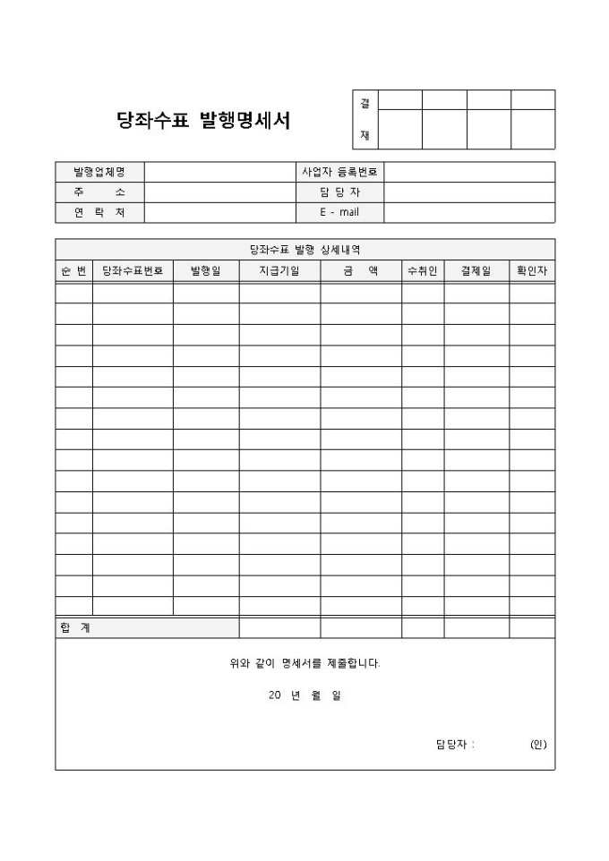 당좌수표견본 명세서 입니다. 발행업체명, 사업자등록번호, 주소, 연락처, 담당자 등으로 구성되었으며, 지급기일 및 수령확인에도 용이합니다.