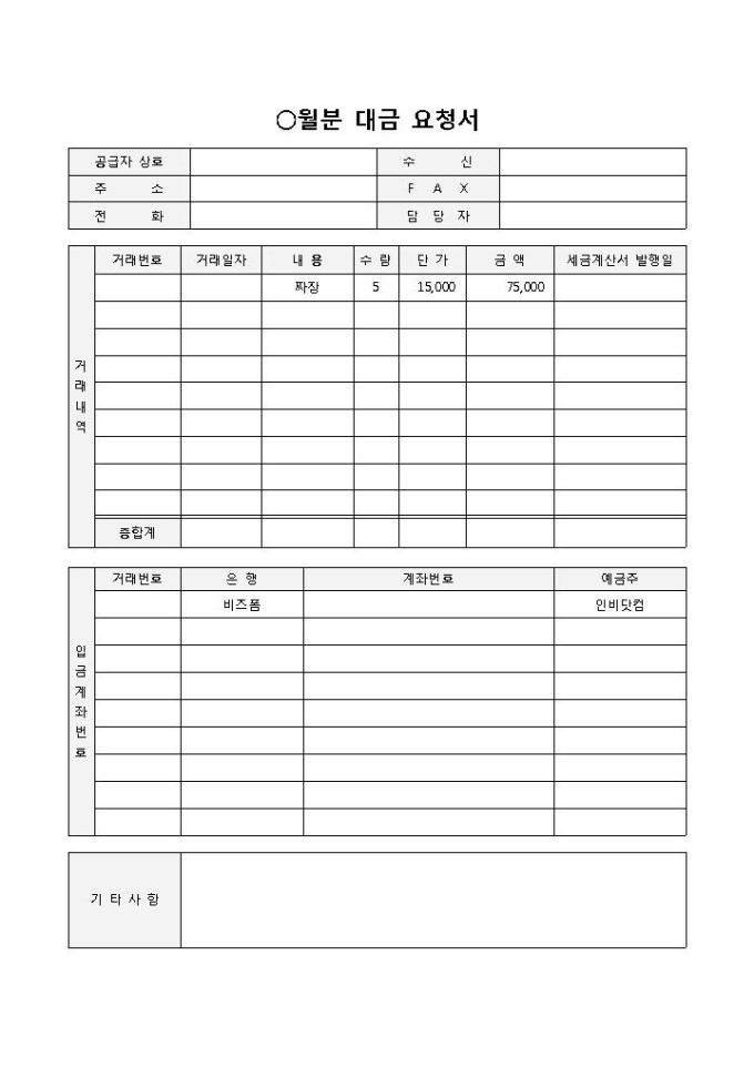 9,000원/월월분대금요청서 입니다. 공급자 상호, 주소, 전화, 수신, FAX, 거래내역, 입금계좌번호 등으로 구성되었습니다. 기타사항을 통해 세부사항을 추가로 기입할 수 있습니다.
