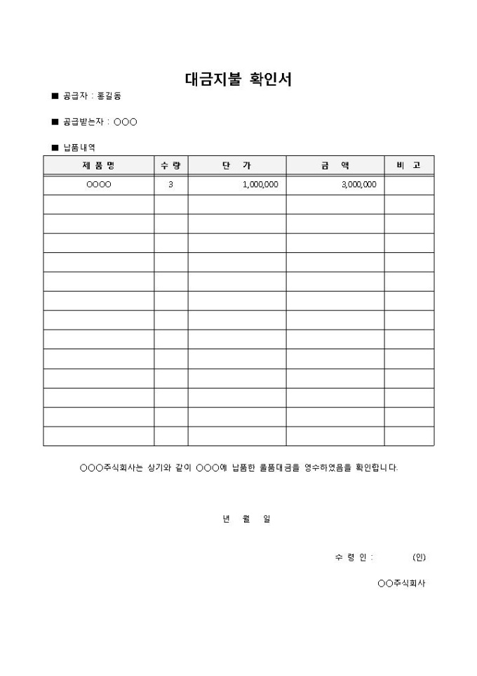 9,000원/월공급자, 공급받는자, 납품내역 등의 항목으로 구성되어 있는 대금을 지불했을 때의 확인을 위해 쓰이는 대금지불 확인서입니다.