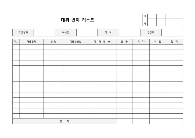 대위변제리스트 입니다. 대출일자, 성명, 계좌번호, 원금, 이자, 비용 합계 등으로 구성되었으며, 대출 상환일 확인에 용이합니다.