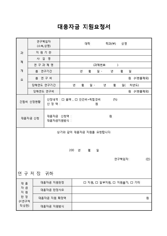 9,000원/월대응자금 지원요청서입니다. 과제 개요, 연구책임자, 지원기관, 사업명, 연구과제명, 총 연구기간, 총 연구비, 당해연도 연구기간, 당해연도 연구비 등으로 구성되어 있습니다. 위와 같이 대응자금에 대한 지원을 요청할 때 작성하여 사용할 수 있습니다.