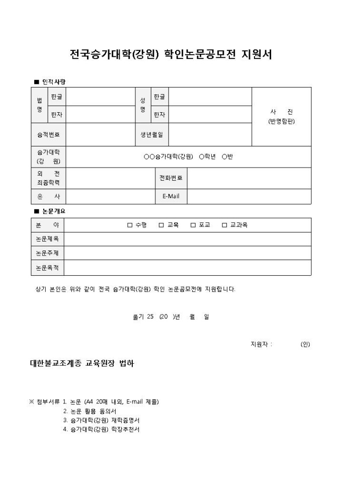 대학논문지원서입니다. 법명, 성명, 주민등록번호, 전화번호 등의 항목으로 구성되어 있습니다. 전국 승가대학 학인논문 공모전에 참가 지원할 경우 사용할 수 있는 지원서 양식입니다.