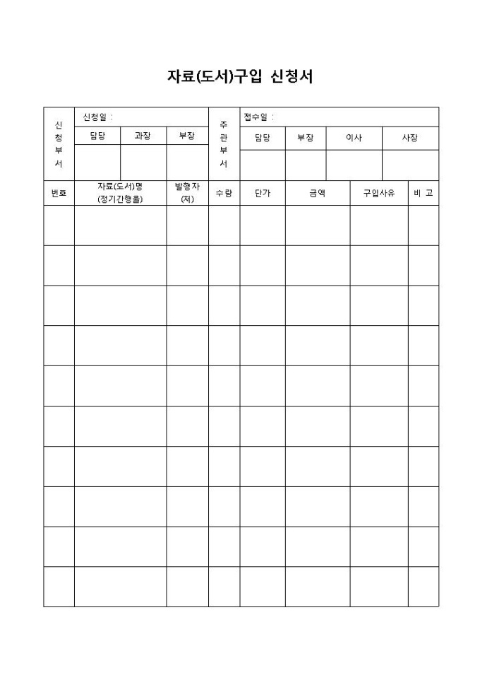 9,000원/월도서구입신청서(자료)입니다. 신청부서, 자료명, 발행자, 수량, 단가, 금액 등의 항목으로 구성되어 있습니다. 자료와 도서에 대해 구입 신청시 사용할 수 있으며, 신청부서와 주관부서의 결재란이 함께 있는 양식입니다.