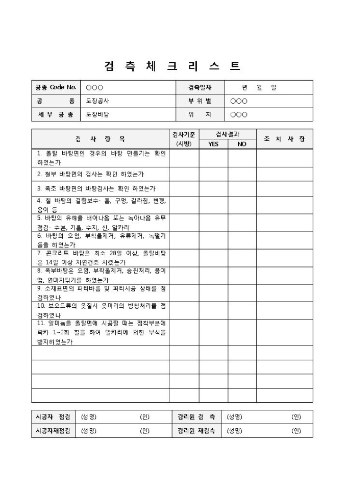 9,000원/월도장 공사용으로 쓰이는 검측 체크리스트입니다. 검측일자, 위치, 검사항목, 검사기준, 검사결과, 조시사항 등의 항목으로 구성되어 있습니다.
