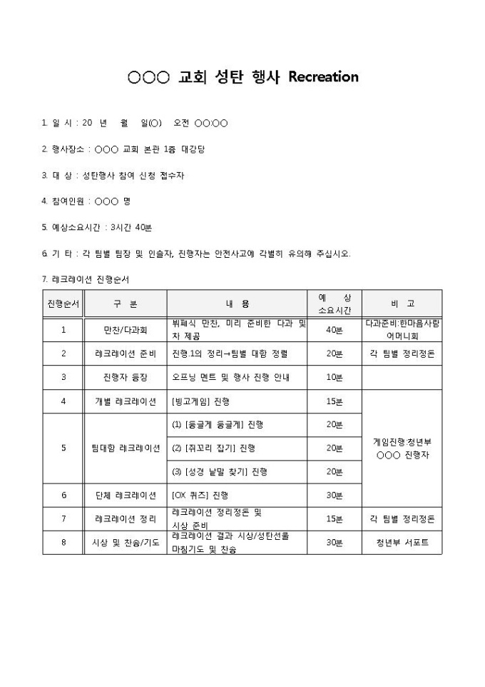 9,000원/월레크레이션프로그램진행표입니다. 일시, 장소, 대상, 참여인원, 예상소요시간 등의 항목으로 구성되어 있습니다. 교회에서 성탄행사 레크레이션 진행시 사용할 수 있는 진행표 양식입니다.