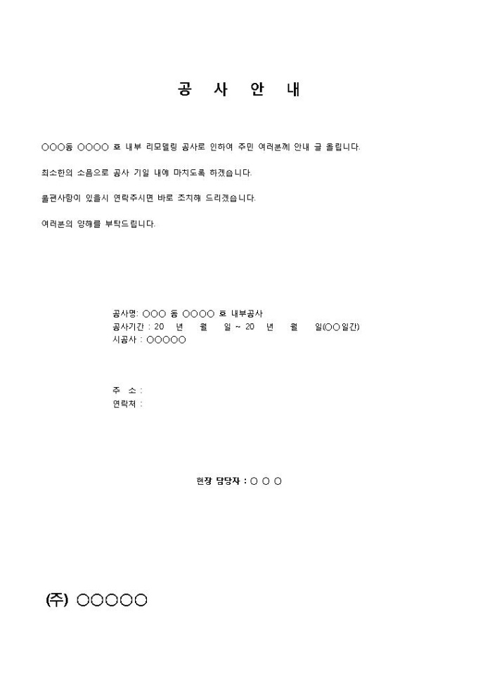 9,000원/월리모델링공사안내문입니다. 공사명, 공사기간, 시공사 등의 항목으로 구성되어 있습니다. 아파트에서 리모델링 공사에 대해 안내하고 양해를 바라는 내용의 안내문 양식입니다.