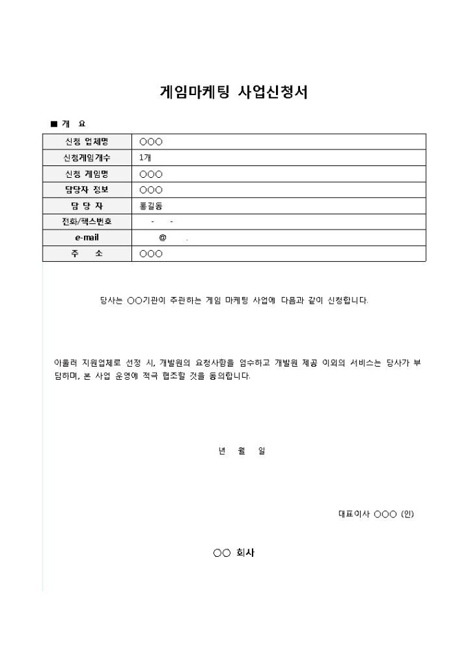 해당 기관이 주관하는 게임 마케팅 사업에 신청을 할 때 사용되는 마케팅 사업신청서(게임) 양식입니다. 신청 업체명, 신청 게임 개수, 신청 게임명, 담당자 정보, 담당자, 전화 및 팩스번호, 이메일, 주소 등의 항목으로 구성되어 있습니다.