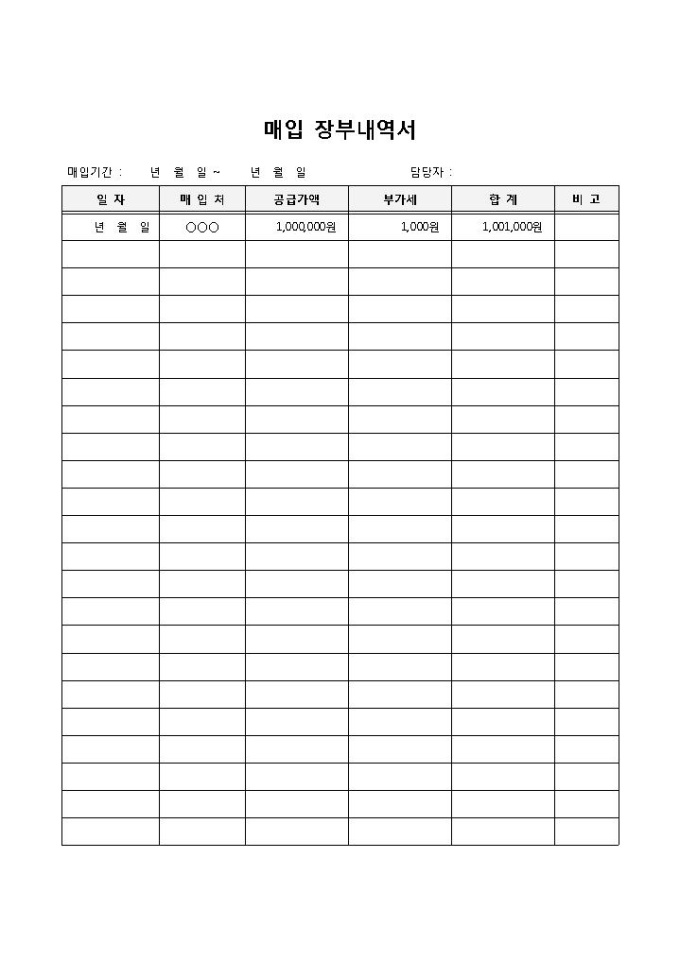 9,000원/월매입기간, 매입처, 공급가액, 합계 등의 항목으로 구성되어 있는 매입 관리를 위한 매입 장부내역서입니다.
