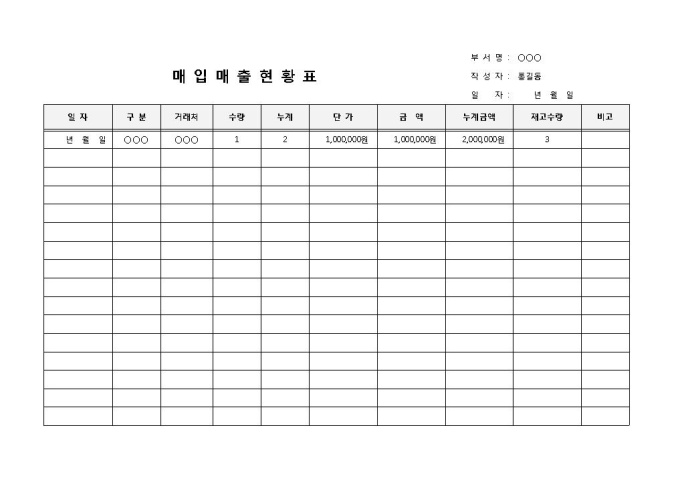 일자, 구분, 거래처, 수량, 누계, 단가, 금액 등의 항목으로 구성되어 있는 매입매출 현황을 작성하는 매입매출 현황표 양식입니다.