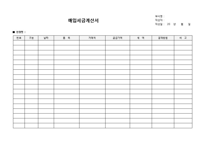 9,000원/월매입세금계산서입니다. 번호, 구분, 날짜, 품목, 거래처, 공급가액 등의 항목으로 구성되어 있습니다. 여러 항목의 매입 내역에 대해 세금계산서 작성 시 사용할 수 있는 양식입니다.