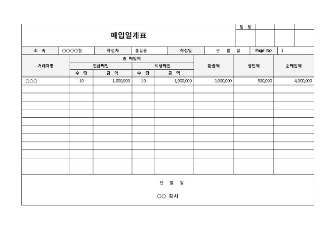 경리부서 등 회사의 매입을 관리하는 곳에서 주로 쓰이고 하루 동안 일어난 매입액을 집계할 때 사용되는 매입일계표(상세양식) 양식입니다. 소속, 작성자, 작성일, 거래처명, 총 매입액, 환출액, 할인액, 순매입액 등의 항목으로 구성되어 있습니다.