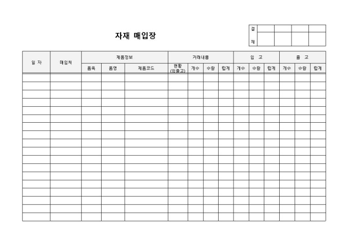 자재 매입장 입니다. 일자, 매입처, 제품정보, 거래내용, 입고, 출고 등으로 구성되었습니다. 매입처에 따른 자재를 파악하고 입, 출고 현황 기록에 용이한 양식입니다.