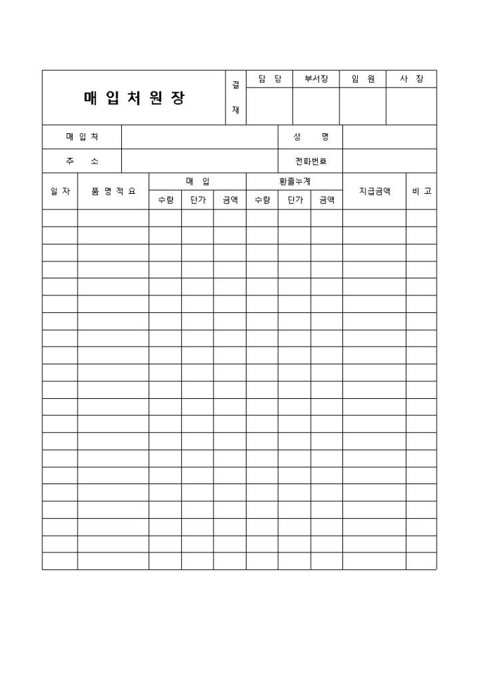 9,000원/월매입처원장(기본양식)입니다. 매입처, 주소, 일자, 품명적요, 매입 등의 항목으로 구성되어 있습니다. 회사에서 물품의 매입 내역에 대해 작성할 경우 사용할 수 있는 기본적인 양식입니다.