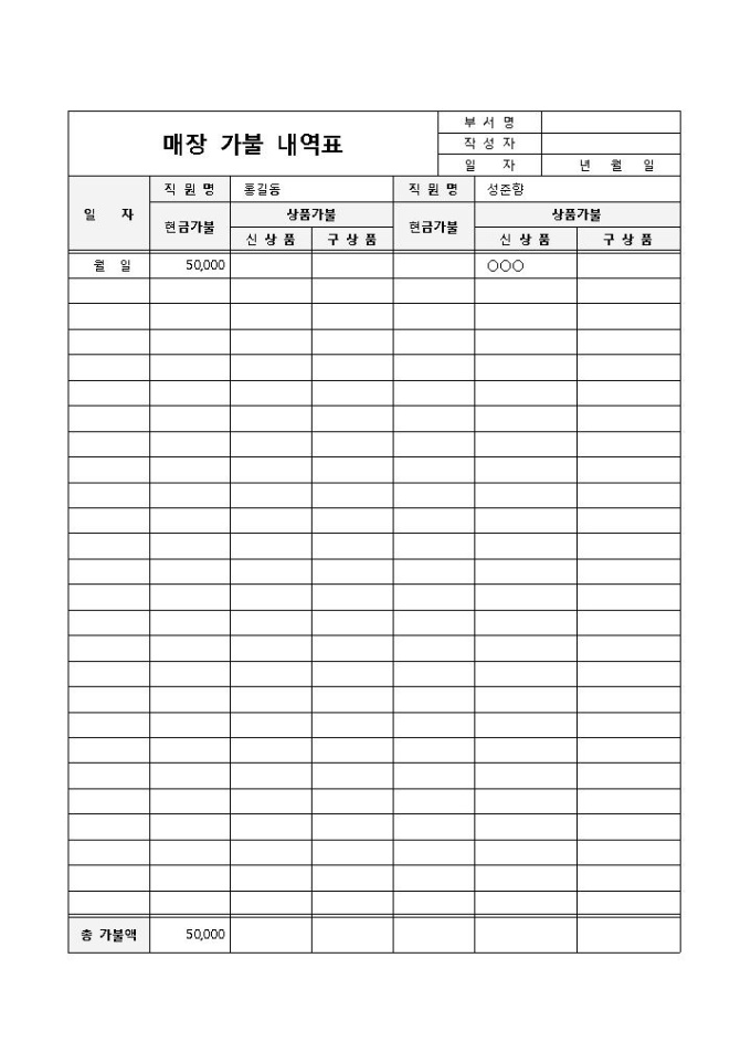 매장에서 사용되는 가불의 내역을 현금인지 상품인지로 구분하여 기록하거나 통계할 때 사용되는 매장 가불내역표 양식입니다. 직원명, 일자, 현금가불, 상품가불, 총 가불액 등의 항목으로 구성되어 있습니다.