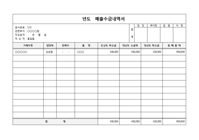 연간 매출의 수금 및 미수금의 액수를 기록하고 통계하기 위해서 사용되는 매출 수금내역서(연간) 양식입니다. 거래처명, 담당자, 연락처, 품명, 전년도 및 당년도 미수금, 당년도 수금액, 총 매출액 등의 항목으로 구성되어 있습니다.