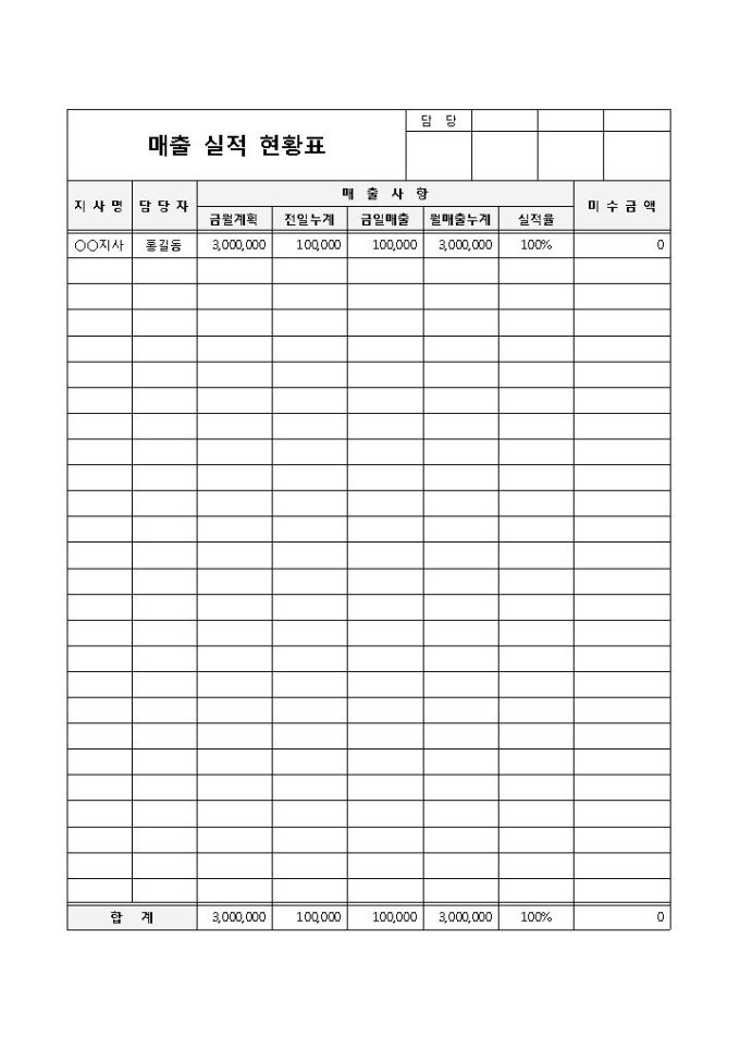 금월계획, 전일누계, 금일매출, 월 매출누계, 실적율을 고려하여 매출의 실적을 기록하고 통계할 때 사용되는 매출실적현황표 양식입니다. 지사명, 담당자, 매출사항, 미수금액, 합계 등의 항목으로 구성되어 있습니다.