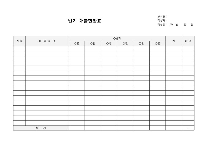 9,000원/월매출현황표(반기)입니다. 번호, 매출처명, 반기, 월 등의 항목으로 구성되어 있습니다. 매출 현황에 대해 월별, 반기별로 작성할 수 있는 양식입니다.