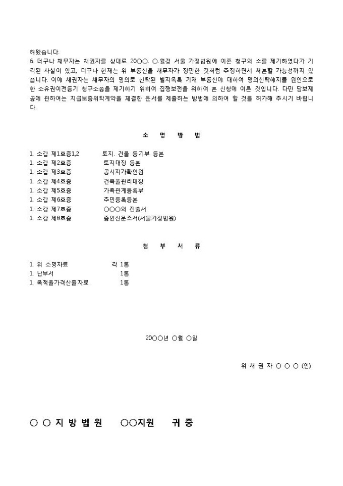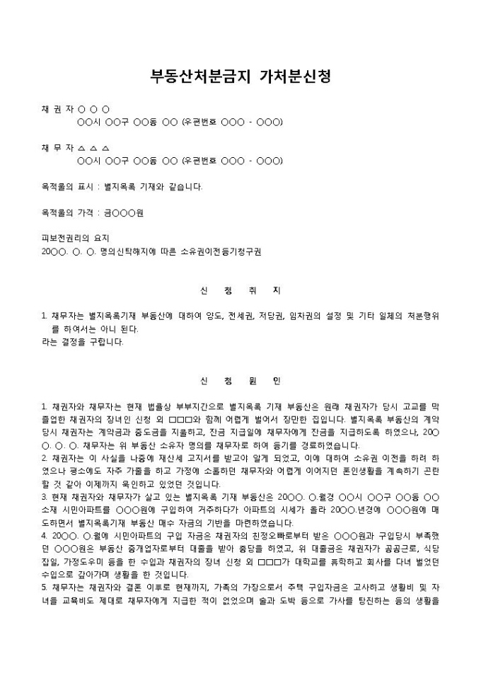 9,000원/월명의신탁해지가처분신청입니다. 채권자, 채무자의 정보, 목적물의 표시, 목적물의 가격 등의 항목으로 구성되어 있습니다. 채무자가 부동산에 대하여 양도, 전세권, 저당권, 임차권 등의 일체 처분행위를 하는 것을 금지하는 가처분 신청서 양식입니다.