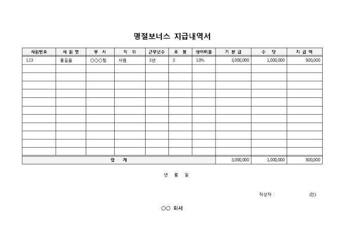 회사 내 명절보너스 지급에 대한 내역을 기재할 때 사용되는 명절보너스 지급내역서 양식입니다. 사원번호, 사원명, 부서, 직위, 근무년수, 호봉, 상여비율, 기본급, 수당, 지급액, 합계 등의 항목으로 구성되어 있습니다.