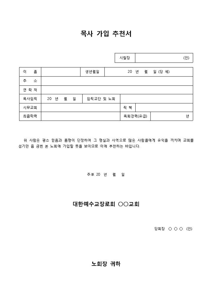 목사가입추천서