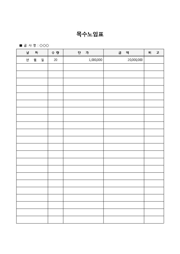 날짜, 수량, 단가, 금액을 고려하여 기록하고 관리할 때 사용되는 목수노임표 양식입니다. 공사명, 날짜, 수량, 단가, 금액, 비고의 항목으로 구성되어 있습니다.