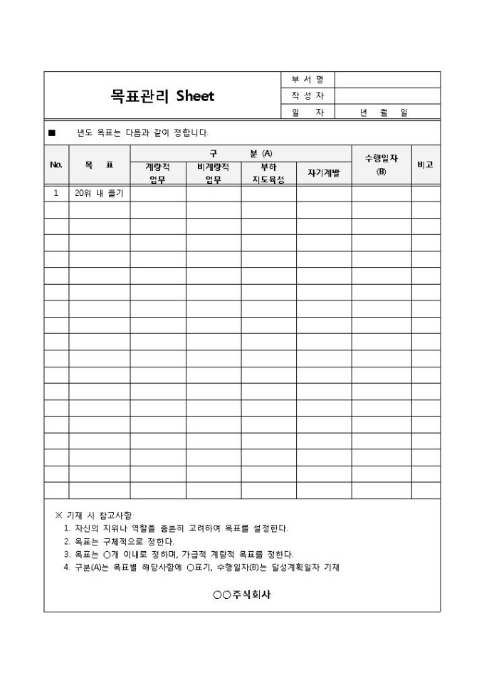계량이나 비계량적 업무의 목표 등을 관리할 때 사용하는 목표관리 Sheet 양식입니다. 목표, 계량적업무, 비계량적업무, 부하지도육성, 자기계발, 수행일자 등의 항목으로 구성되어 있습니다.