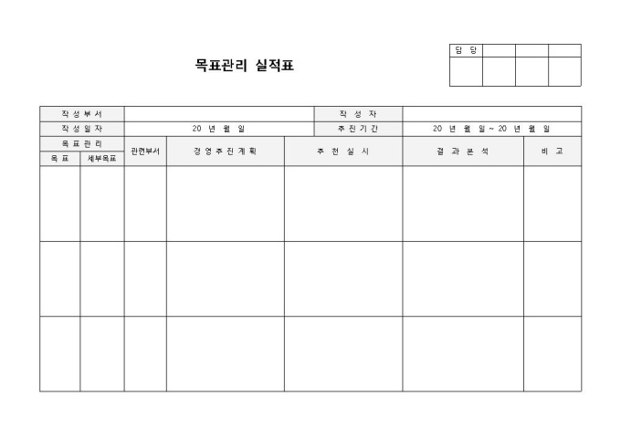 9,000원/월목표관리실적표입니다. 작성부서, 작성일자, 관련부서, 경영추진 등의 항목으로 구성되어 있습니다. 회사에서 목표관리 실적 내역을 작성할 경우 사용할 수 있는 양식입니다.
