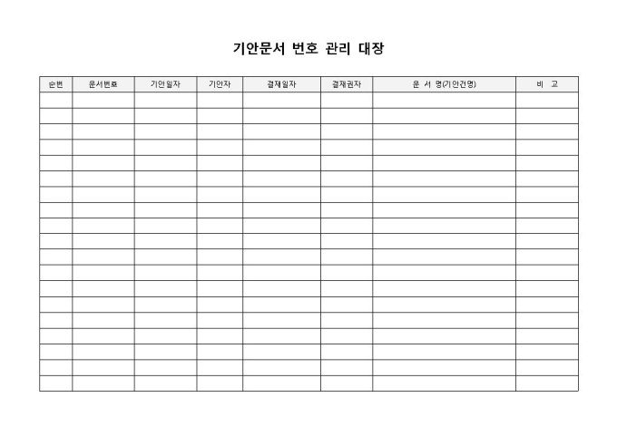 9,000원/월문서관리번호(기안문서)입니다. 순번, 문서번호, 기안일자, 기안자, 결재일자, 결재권자 등의 항목으록 구성되어 있습니다. 회사에서 기안문서 관리시 문서번호와 정보를 작성하여 관리 할 수 있는 양식입니다.