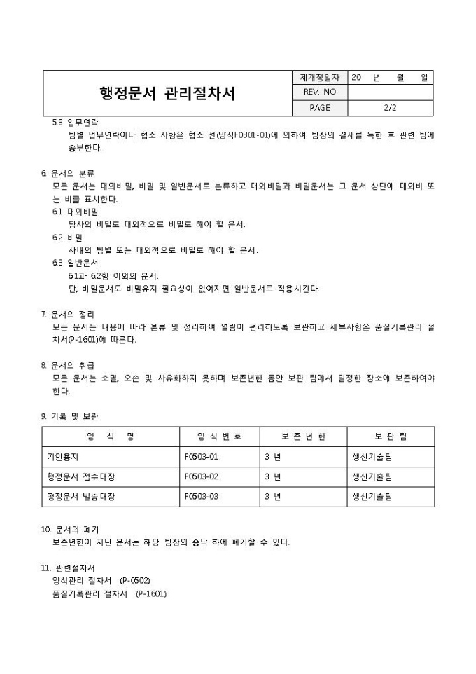 9,000원/월문서관리절차서입니다. 적용범위, 목적, 업무담당, 대외문서 처리절차 등의 항목으로 구성되어 있습니다. 사규를 제외한 제반문서 처리 절차와 업무절차에 대해 규정한 절차서 양식입니다.