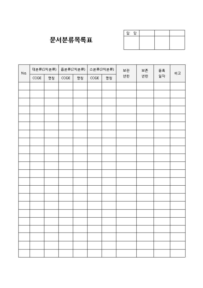 문서목록(분류)입니다. 대분류, 중분류, 소분류, 보관년한 등의 항목으로 구성되어 있습니다. 문서 분류 내역에 대해 기록하여 관리 할 수 있는 목록표 양식입니다.