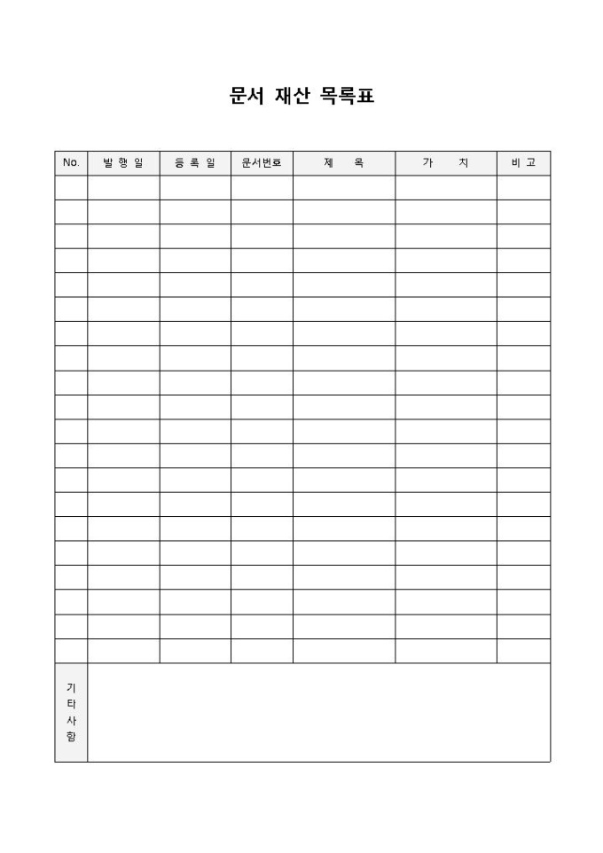 9,000원/월문서목록표(문서재산)입니다. 발행일, 등록일, 문서번호 등의 항목으로 구성되어 있습니다. 문서 재산에 대한 정보를 기록하여 관리할 수 있는 목록표 양식입니다.